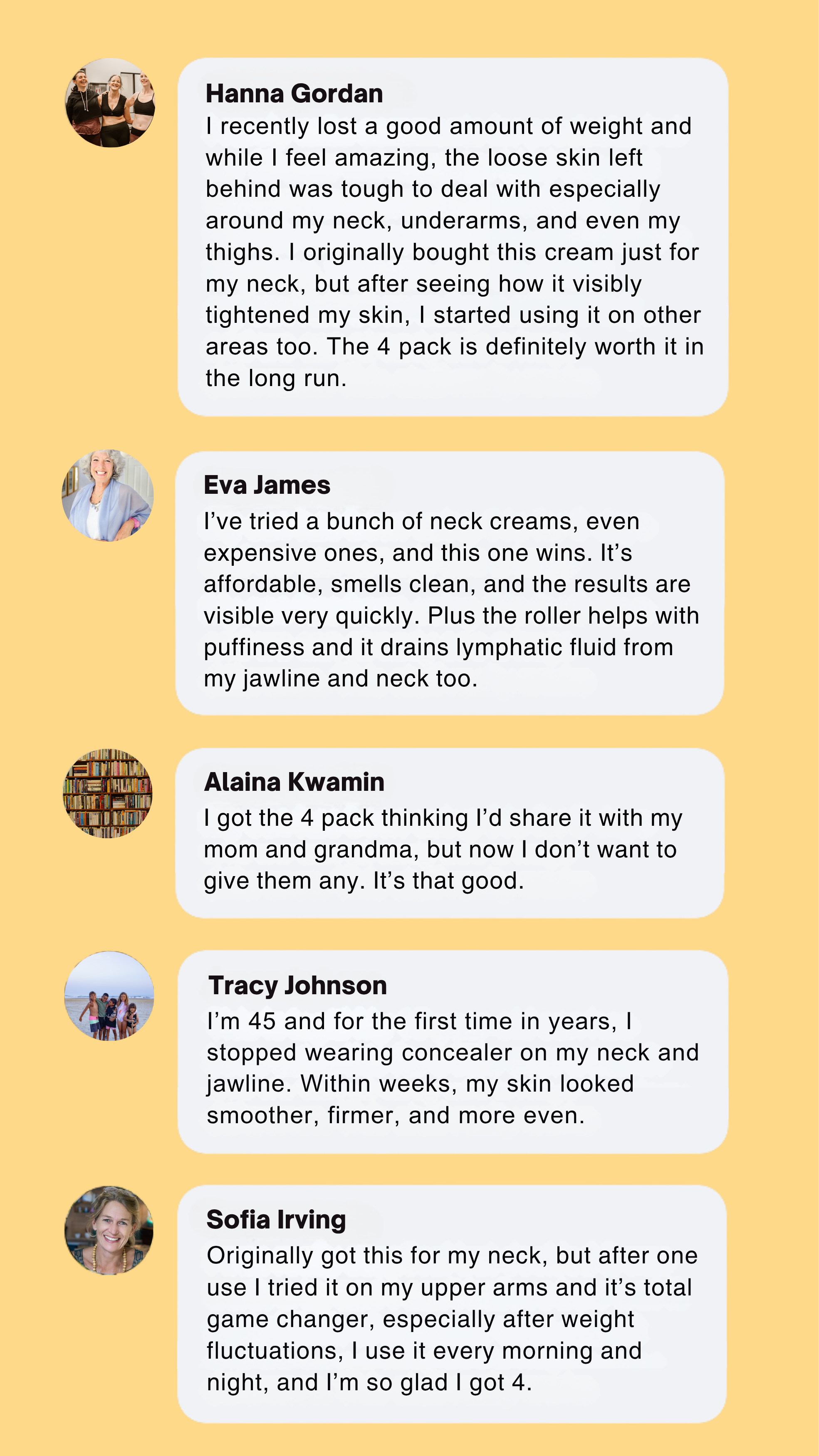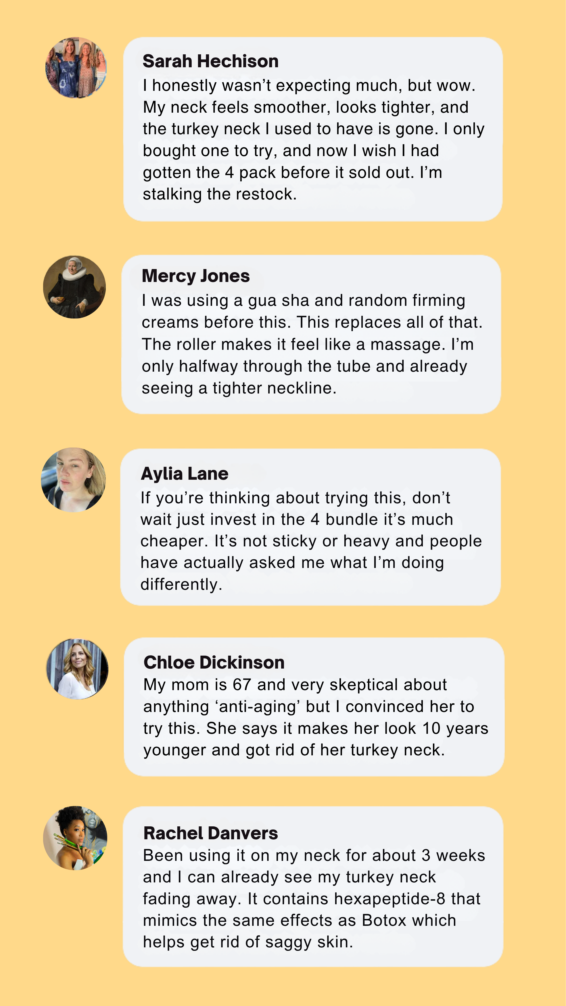 Users report looking up to 10 years younger within weeks. With continued use, skin looks visibly lifted, smoother, and more even-toned — no concealer or makeup needed to hide your neck.